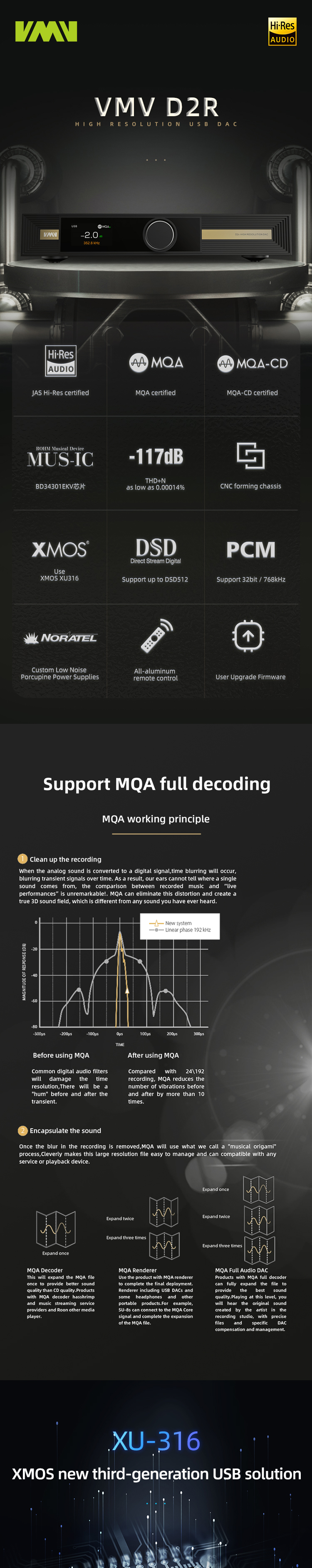 USB uses XMOS XU-316, a real 32bit USB solution, PCM supports up to 768kHz, and DSD supports up to DSD512
