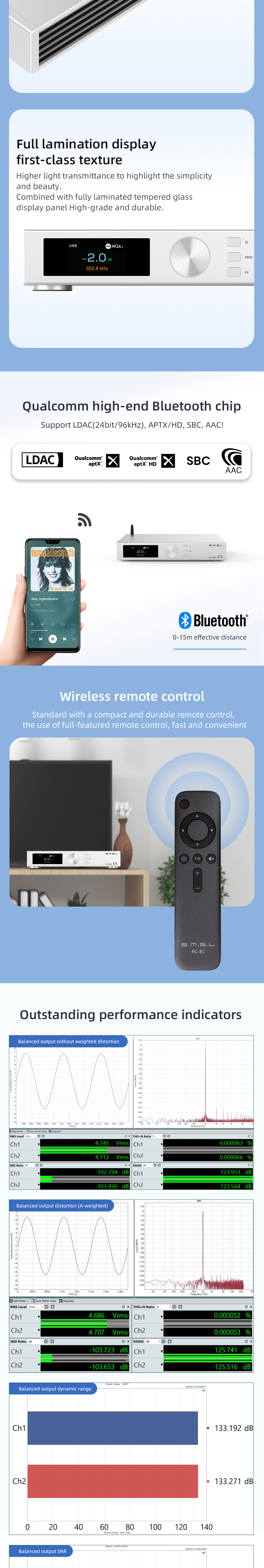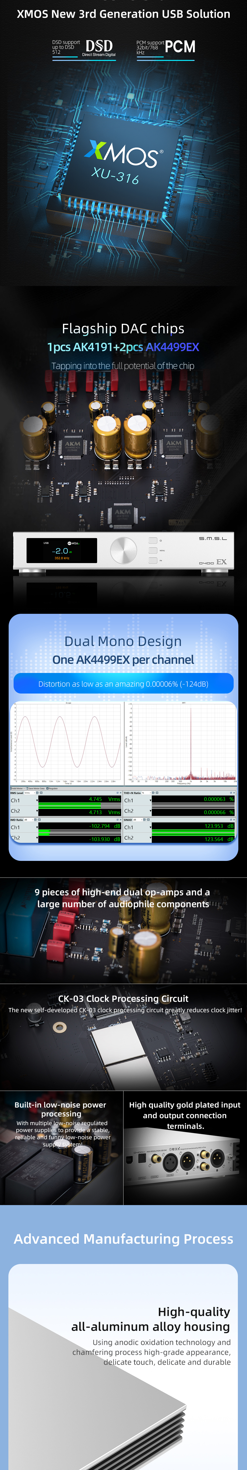 Dual mono design, one AK4499EX per channel, distortion as low as a staggering 0.00006% (-124dB);