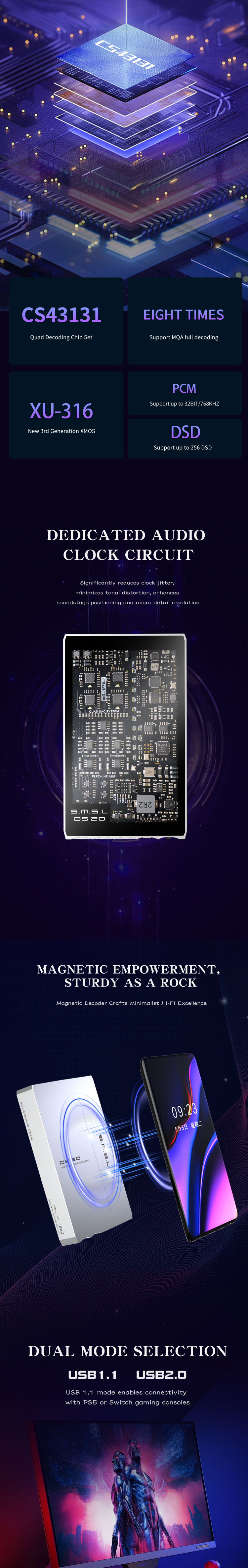 New third-generation XMOS XU-316, PCM support up to 32bit/768kHz, DSD support up toDSD256.